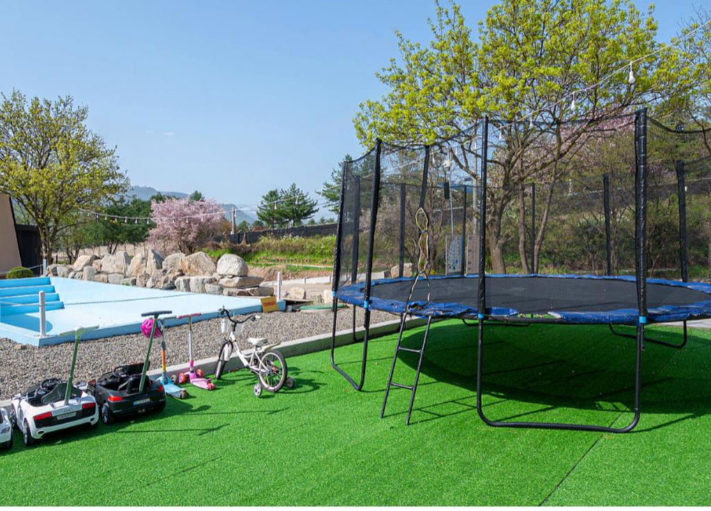 트램펄린 : 아이들의 웃음소리가 끊이지 않는 트램펄린 시설도 마련되어 있습니다. 에너지가 넘치는 아이들이 안전하게 뛰어놀 수 있는 트램펄린도 마련되어 있어 즐거운 시간을 보낼 수 있습니다. 성인 2명까지 탑승 가능하다고 하니 친구들과 어린 시절을 추억하며 뛰어 보는 건 어떨까요?^^